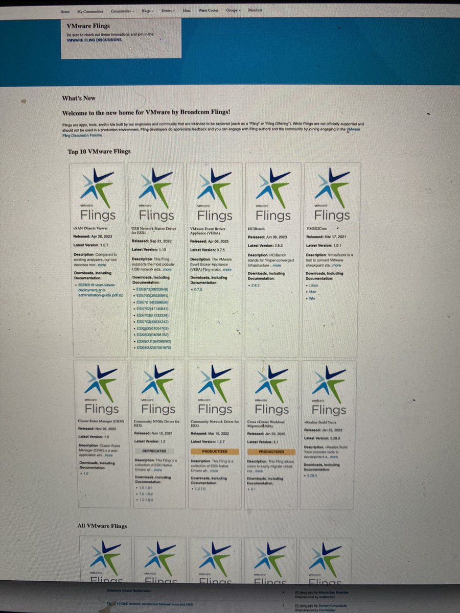 The new #vmware community is launching tonight at https://t.co/OY6joonjzg. All the Flings “145” have been published and can be downloaded directly! Excited to see new positive projects going live. This is our first since joining Broadcom! Flings are on the main menu! https://t.co/t4bqGsW1w4