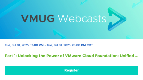 Register to join this two-part in-depth #VMUG webinar exploring the latest innovations in #VCF, with Broadcom Product Marketing Engineers: Dimitri Desmidt, Eric Gray, Feidhlim O’Leary, Kyle Gleed, Pete Koehler and Puneet Chawla. July 1 and July 8.
